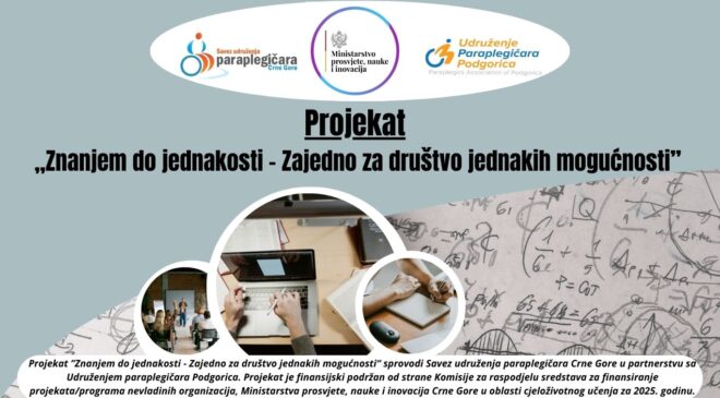 Savez udruženja paraplegičara Crne Gore, u partnerstvu sa Udruženjem paraplegičara Podgorica, realizuje projekat „Znanjem do jednakosti – Zajedno za društvo jednakih mogućnosti“ koji je finansijski podržan od strane Ministarstva prosvjete, nauke i inovacija. Cilj projekta je unapređenje zapošljivosti, digitalne pismenosti i socijalne uključenosti osoba sa invaliditetom (OSI), kao i jačanje kapaciteta organizacija civilnog društva koje djeluju u ovoj oblasti. Projekat se realizuje u periodu od januara do oktobra 2026. godine, a osmišljen je kao odgovor na prepoznate izazove sa kojima se osobe sa invaliditetom suočavaju na tržištu rada, uključujući nedovoljnu…