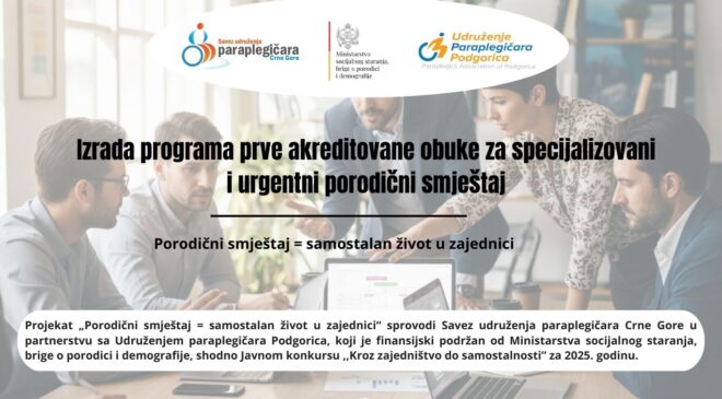 Savez udruženja paraplegičara Crne Gore, u partnerstvu sa Udruženjem paraplegičara Podgorica, u okviru projekta započeo je proces izrade programa obuke za specijalizovani i urgentni porodični smještaj, koji će biti upućen na akreditaciju Zavodu za socijalnu i dječiju zaštitu Crne Gore. Program obuke namijenjen je profesionalcima iz oblasti socijalne i dječije zaštite, sa ciljem jačanja stručnih kapaciteta za rad u složenim i urgentnim situacijama, uz poseban fokus na kvalitet, sigurnost i najbolji interes korisnika, posebno odraslih lica sa invaliditetom. Izrada ovog programa predstavlja prvu projektnu aktivnost i temelj za dalje planirane…