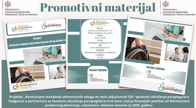 U sklopu medijske promocije projekta „Povećanjem standarda zdravstvenih usluga do veće uključenosti OSI“, izrađuj se promotivni materijal – fascikle, blokovi, hemijske olovke i roll-up baner sa vizuelnim identitetom projekta. Projekat sprovodi Udruženje paraplegičara Podgorica u partnerstvu sa Savezom udruženja paraplegičara Crne Gore, uz podršku Ministarstva prostornog planiranja, urbanizma i državne imovine. Izrada promotivnog materijala ima za cilj povećanje vidljivosti projekta, promociju principa pristupačnosti i ravnopravnosti, kao i podizanje svijesti javnosti o značaju dostupnih zdravstvenih usluga za osobe sa invaliditetom. Promotivni materijal koristiće se tokom realizacije projektnih aktivnosti, sastanaka, seminara, monitoringa…