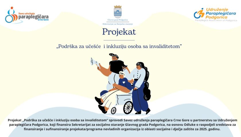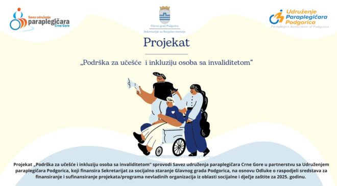 Savez udruženja paraplegičara Crne Gore, u partnerstvu sa Udruženjem paraplegičara Podgorica, realizuje projekat „Podrška za učešće i inkluziju osoba sa invaliditetom“, koji ima za cilj unapređenje socijalne uključenosti, informisanosti i osnaženosti osoba sa invaliditetom u Glavnom gradu Podgorica kroz dostupnu pravnu i psihosocijalnu podršku. Projekat traje 6 mjeseci i finansiran je uz podršku Sekretarijata za socijalno staranje Glavnog grada Podgorica. Osnovni cilj projekta je jačanje kapaciteta osoba sa invaliditetom za ostvarivanje prava iz oblasti socijalne i dječje zaštite, unapređenje njihove emocionalne stabilnosti i osnaživanje za aktivno učešće u društvenim procesima,…