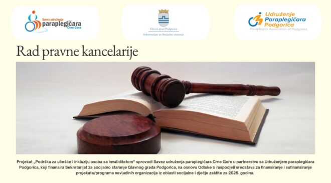 U okviru projekta „Podrška za učešće i inkluziju osoba sa invaliditetom“, Savez udruženja paraplegičara Crne Gore, u partnerstvu sa Udruženjem paraplegičara Podgorica, realizuje aktivnost rada pravne kancelarije sa ciljem pružanja stručne i kontinuirane podrške osobama sa invaliditetom u oblasti socijalne i dječje zaštite. Rad pravne kancelarije podrazumijeva individualno pravno i socijalno savjetovanje, informisanje korisnika o njihovim zakonskim pravima, procedurama i mogućnostima ostvarivanja prava iz sistema socijalne i dječje zaštite, kao i praktičnu podršku u komunikaciji sa nadležnim institucijama. Korisnicima je omogućeno: Cilj ove aktivnosti je osnaživanje osoba sa invaliditetom da…