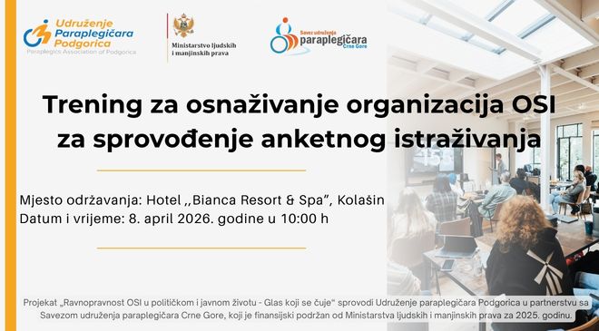 Udruženje paraplegičara Podgorica, u partnerstvu sa Savezom udruženja paraplegičara Crne Gore, organizuje trening za osnaživanje organizacija osoba sa invaliditetom (OSI) za sprovođenje anketnog istraživanja o političkoj participaciji i percepciji diskriminacije OSI u Crnoj Gori. Trening se realizuje u okviru projekta „Ravnopravnost OSI u političkom i javnom životu – Glas koji se čuje“, koji je finansijski podržan od strane Ministarstva ljudskih i manjinskih prava za 2025. godinu. Događaj će biti održan u hotelu „Bianca Resort & Spa“ u Kolašinu, i to Cilj treninga je jačanje kapaciteta organizacija OSI za kvalitetno, stručno…
