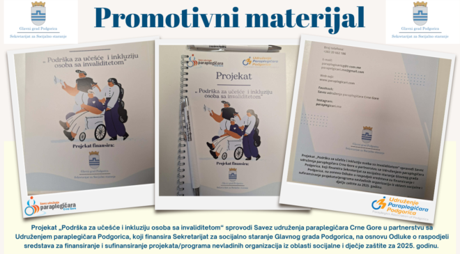 U sklopu medijske promocije projekta „Podrška za učešće i inkluziju osoba sa invaliditetom“, izrađen je promotivni materijal koji obuhvata fascikle, blokove, hemijske olovke i roll-up baner sa vizuelnim identitetom projekta. Projekat sprovodi Savez udruženja paraplegičara Crne Gore u partnerstvu sa Udruženjem paraplegičara Podgorica, uz podršku Sekretarijata za socijalno staranje Glavnog grada Podgorica. Izrada promotivnog materijala ima za cilj povećanje vidljivosti projekta, promociju principa inkluzije, ravnopravnosti, kao i podizanje svijesti javnosti o značaju podrške i dostupnih usluga za osobe sa invaliditetom. Promotivni materijal koristiće se tokom realizacije projektnih aktivnosti, radionica, sastanaka…