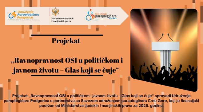 Udruženje paraplegičara Podgorica u partnerstvu sa Savezom udruženja paraplegičara Crne Gore započeo realizaciju projekta „Ravnopravnost OSI u političkom i javnom životu – Glas koji se čuje“, finansijski podržanog od strane Ministarstva ljudskih i manjinskih prava, u okviru javnog konkursa u oblasti zaštite lica sa invaliditetom. Osnovni cilj projekta je unapređenje ravnopravnog i inkluzivnog učešća osoba sa invaliditetom, sa posebnim akcentom na žene, u političkom i javnom životu Crne Gore. Projekat doprinosi podizanju svijesti o značaju političkih prava OSI, smanjenju diskriminacije i povećanju njihove vidljivosti kao ravnopravnih učesnika u procesima donošenja…