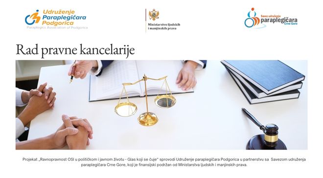 „Ravnopravnost OSI u političkom i javnom životu – Glas koji se čuje“ U okviru projekta „Ravnopravnost OSI u političkom i javnom životu – Glas koji se čuje“, koji sprovodi Udruženje paraplegičara Podgorica u partnerstvu sa Savezom udruženja paraplegičara Crne Gore, a koji je finansijski podržan od strane Ministarstva ljudskih i manjinskih prava, uspostavljen je rad pravne kancelarije sa ciljem jačanja pravne zaštite i unapređenja učešća osoba sa invaliditetom u političkom i javnom životu. Pravna kancelarija pruža besplatnu pravnu podršku osobama sa invaliditetom kroz davanje pravnih savjeta, informacija i stručnih mišljenja,…