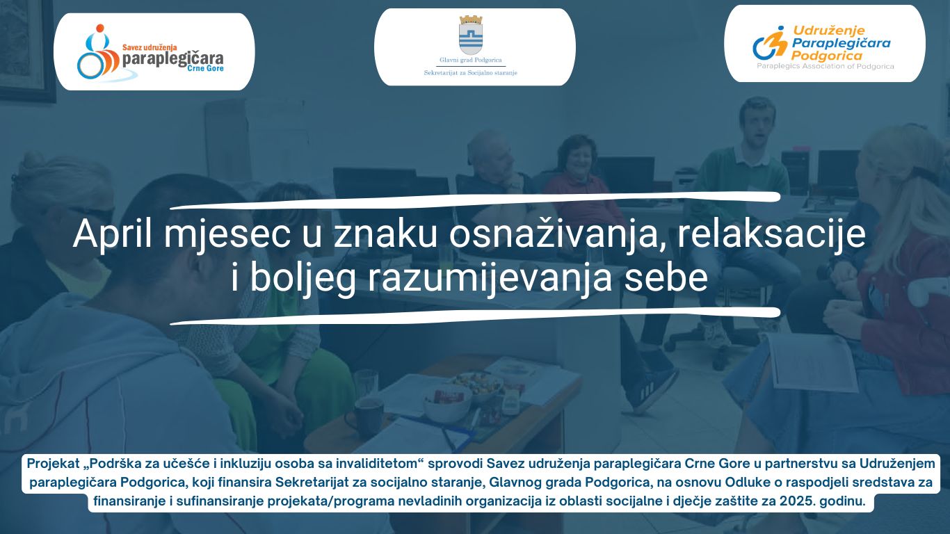 Tokom mjeseca aprila realizujemo psihosocijalne radionice za osobe sa invaliditetom na teme „Tijelo, emocije i relaksacija“, koje imaju za cilj jačanje povezanosti sa sobom, razvijanje emocionalne svjesnosti, kao i učenje tehnika opuštanja i samoregulacije.