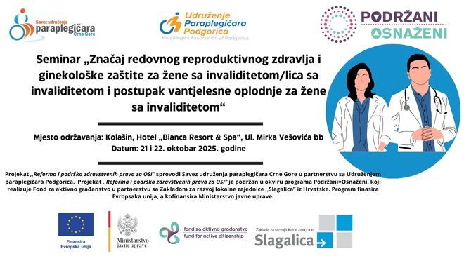 Savez udruženja paraplegičara Crne Gore, u partnerstvu sa Udruženjem paraplegičara Podgorica, u okviru projekta „Reforma i podrška zdravstvenih prava za osobe sa invaliditetom“ organizuje dvodnevni seminar pod nazivom „Značaj redovnog reproduktivnog zdravlja i ginekološke zaštite za žene sa invaliditetom / lica sa invaliditetom i postupak vantjelesne oplodnje za žene sa invaliditetom“, koji će se održati u Kolašinu, u hotelu „Bianca Resort & Spa“, dana 21. i 22. oktobra 2025. godine.