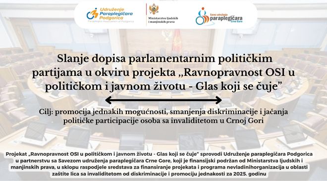 U okviru projekta „Ravnopravnost OSI u političkom i javnom životu – Glas koji se čuje“, koji sprovodi Udruženje paraplegičara Podgorica u partnerstvu sa Savezom udruženja paraplegičara Crne Gore, a uz finansijsku podršku Ministarstva ljudskih i manjinskih prava Crne Gore, realizovana je aktivnost slanja dopisa parlamentarnim političkim partijama.